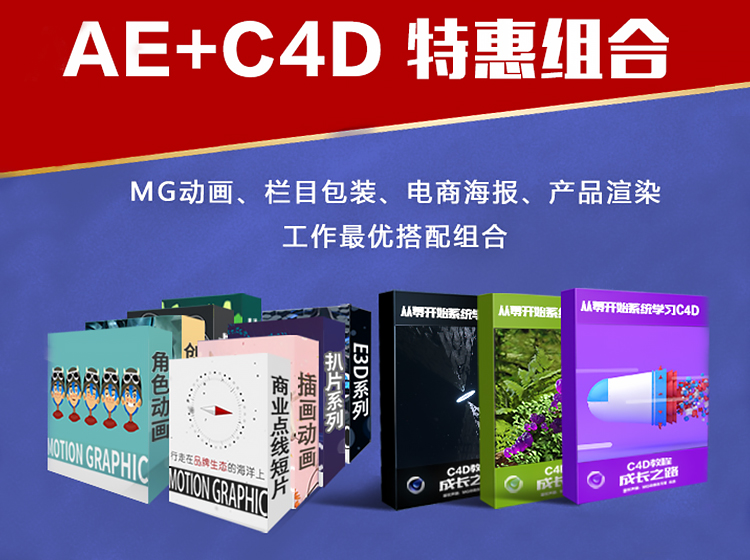这个包含AE和C4D两套教程,内容一样,价格会更优惠一些,如果需要学习这两套教程的同学,可以考虑购买这个打包商品,会优惠一些。